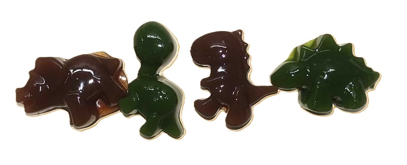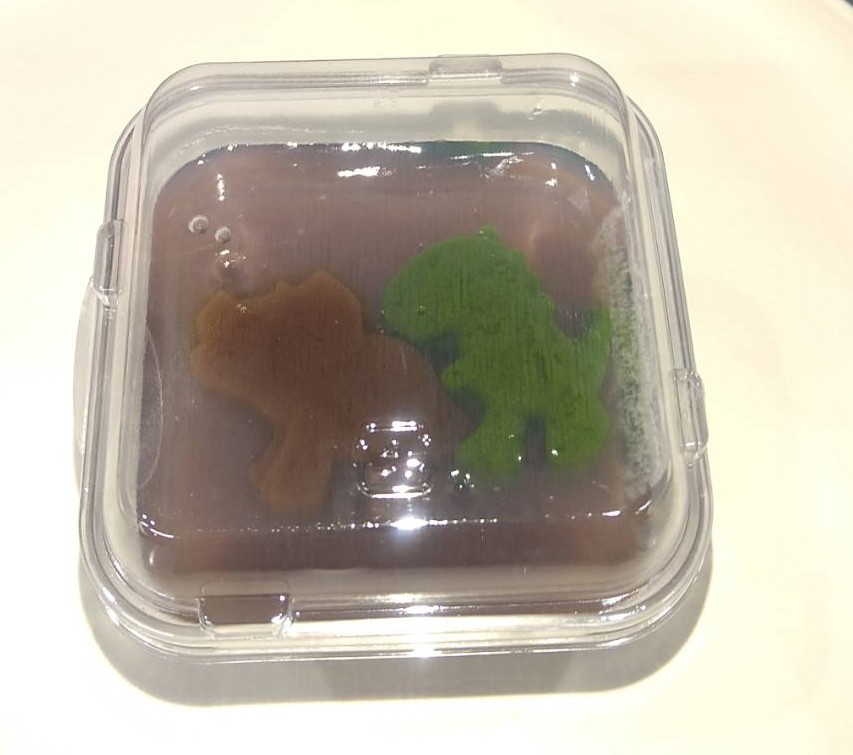 ・黒糖がきいたくにケーの水ようかんの上にさっぱり寒天をのせ、抹茶寒天の恐竜を浮かべました。